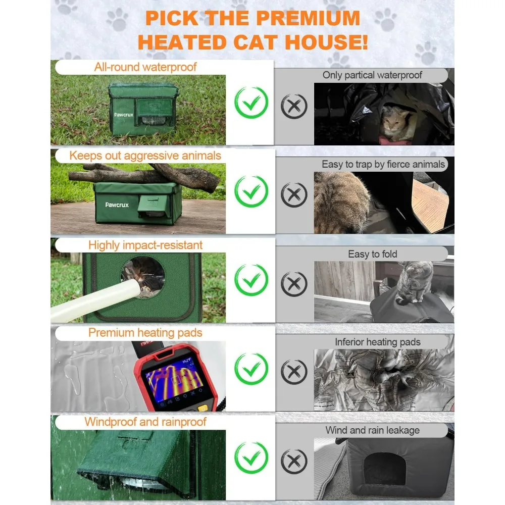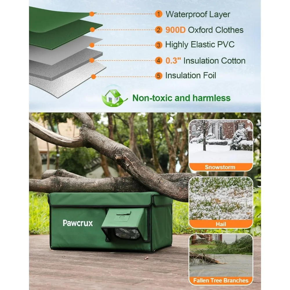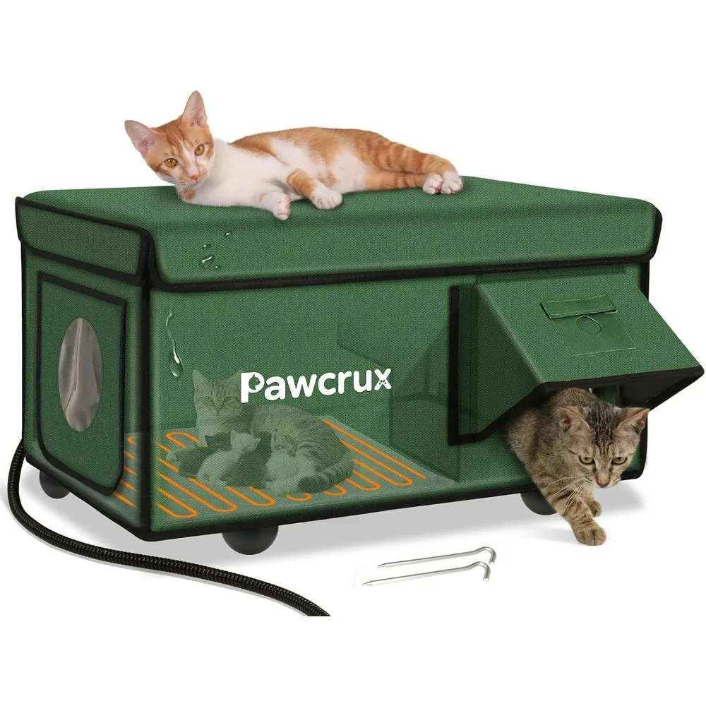This outdoor heated cat house is designed to keep your cat warm and comfortable during the cold winter months. It features aluminum foil insulation to maintain a cozy temperature inside. Built to withstand harsh weather conditions such as rain, wind, and snow, this weatherproof cat shelter is durable and secure, providing a safe haven for stray cats, kittens, and small animals like rabbits. The unique escape door allows cats to exit easily while keeping predators out. The elevated design of this heated cat bed prevents moisture from accumulating at the base, ensuring a dry and comfortable environment. The waterproof features, including the eaves, roof, and escape door, are all designed to resist wind and rain, keeping your cat's space dry. The cat house is easy to clean, with a roof that can be opened for maintenance, and it assembles quickly without tools. Ideal for placement on porches, garages, or barns, this heated cat house is a sturdy and indestructible choice for any cat lover. It offers protection from the elements and is backed by a superior quality guarantee. Should you encounter any issues with the purchase or use of the product, our customer service is ready to assist you and your pet.
